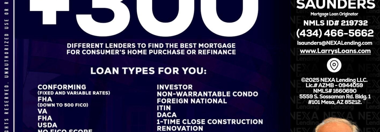 300+ LENDERS - Larry Saunders -Mortgage Loan OriginatorHi, my name is Larry Saunders. I’m a Loan Officer with NEXA Lending LLC., offering personalized mortgage solutions, fast customized quotes, great rates and service with integrity.