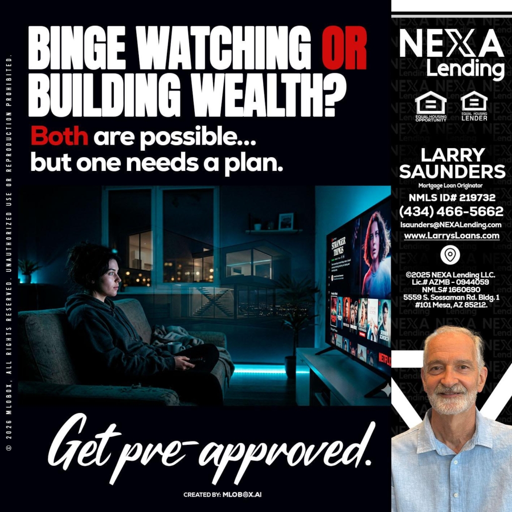 BINGE WATCHING - Larry Saunders -Mortgage Loan OriginatorHi, my name is Larry Saunders. I’m a Loan Officer with NEXA Lending LLC., offering personalized mortgage solutions, fast customized quotes, great rates and service with integrity.