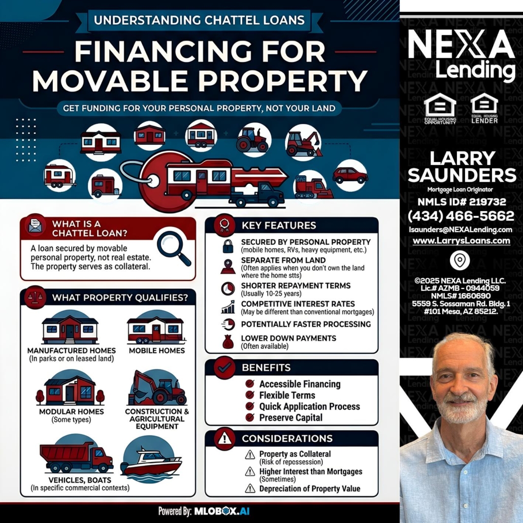 Hi, my name is Larry Saunders. I’m a Loan Officer offering personalized mortgage solutions, fast customized quotes, great rates and service with integrity. If you’re interested in learning more about the Chattel loan or any other, just let me know and I’ll walk you through your options.