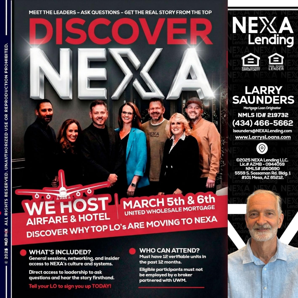 DISCOVER NEXA - Larry Saunders -Mortgage Loan OriginatorHi, my name is Larry Saunders. I’m a Loan Officer with NEXA Lending LLC., offering personalized mortgage solutions, fast customized quotes, great rates and service with integrity.