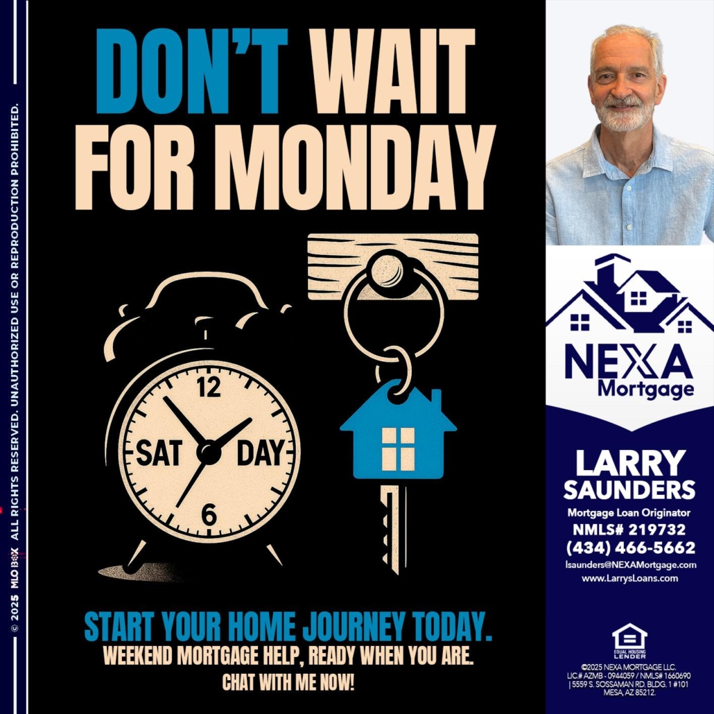 Hi, my name is Larry Saunders. I’m a Loan Officer with NEXA Mortgage LLC., offering personalized mortgage solutions, fast customized quotes, great rates and service with integrity.