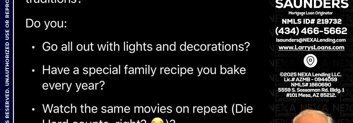 I love christmas - Larry Saunders -Mortgage Loan OriginatorHi, my name is Larry Saunders. I’m a Loan Officer with NEXA Lending LLC., offering personalized mortgage solutions, fast customized quotes, great rates and service with integrity.