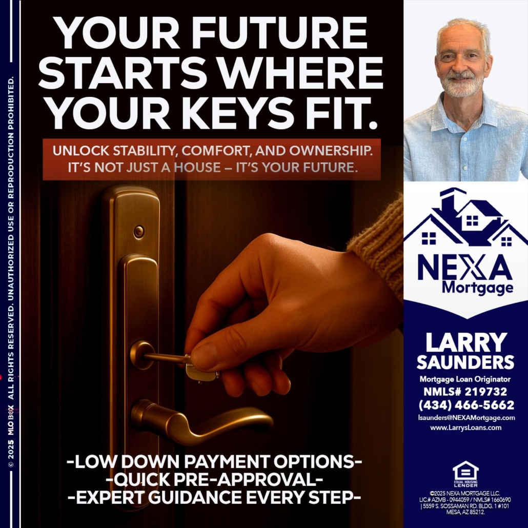 YOUR FUTURE - Larry Saunders -Mortgage Loan OriginatorHi, my name is Larry Saunders. I’m a Loan Officer with NEXA Mortgage LLC., offering personalized mortgage solutions, fast customized quotes, great rates and service with integrity.